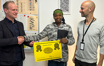 ... Samuel Osakue aus der 07F. Mit einer souveränen Leistung setzte er sich gegen die Klassensieger der anderen Klassen durch. Sein Lesevortrag eines Fairytales (Märchens) konnte die aus Zehntklässlern bestehende Jury klar überzeugen. Dafür gab es aus der Hand des Schulleiters Daniel Wuttke ein Buch, das vom Förderverein gestiftet wurde. "Mit dem Wettbewerb möchte die Fachschaft Englisch die Leselust fördern", betonte Bernward Halbfas die Bedeutung des Wettbewerbs. Bei Samuel hat es sichtlich funktioniert.