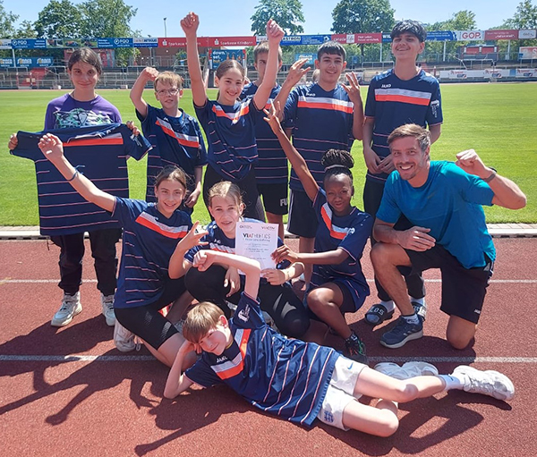 Überzeugten mit guten Leistungen: Olgenita Cerepi, Lilly Heisig, Amba Keita, Felix Frank, Helena Dörner, Daniele Freiburg, Lais Malik, Navruz Sharifzoda, Max Dervaux, Noemi Pulli, Nick Sommerfeld. Mit auf dem Bild Johannes Rahn, Sportlehrer und Teamleiter