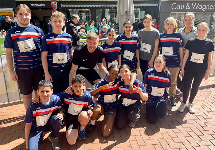 Gute Laune und Spaß am Sport: Teilnehmerinnen und Teilnehmer mit Sportlehrer Johannes Rahn beim Frühlingslauf