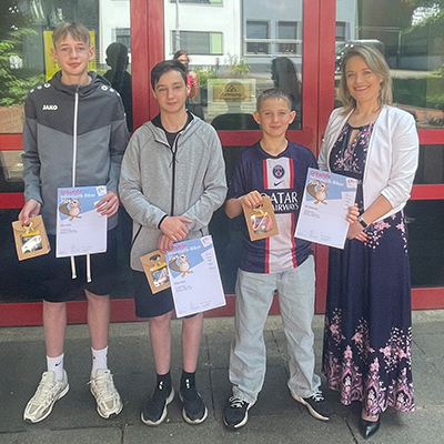 Stolz präsentieren  Mika Abels, Milan Kurm und Ilya Remenuk zusammen mit Tünde Bodi ihre Urkunden.